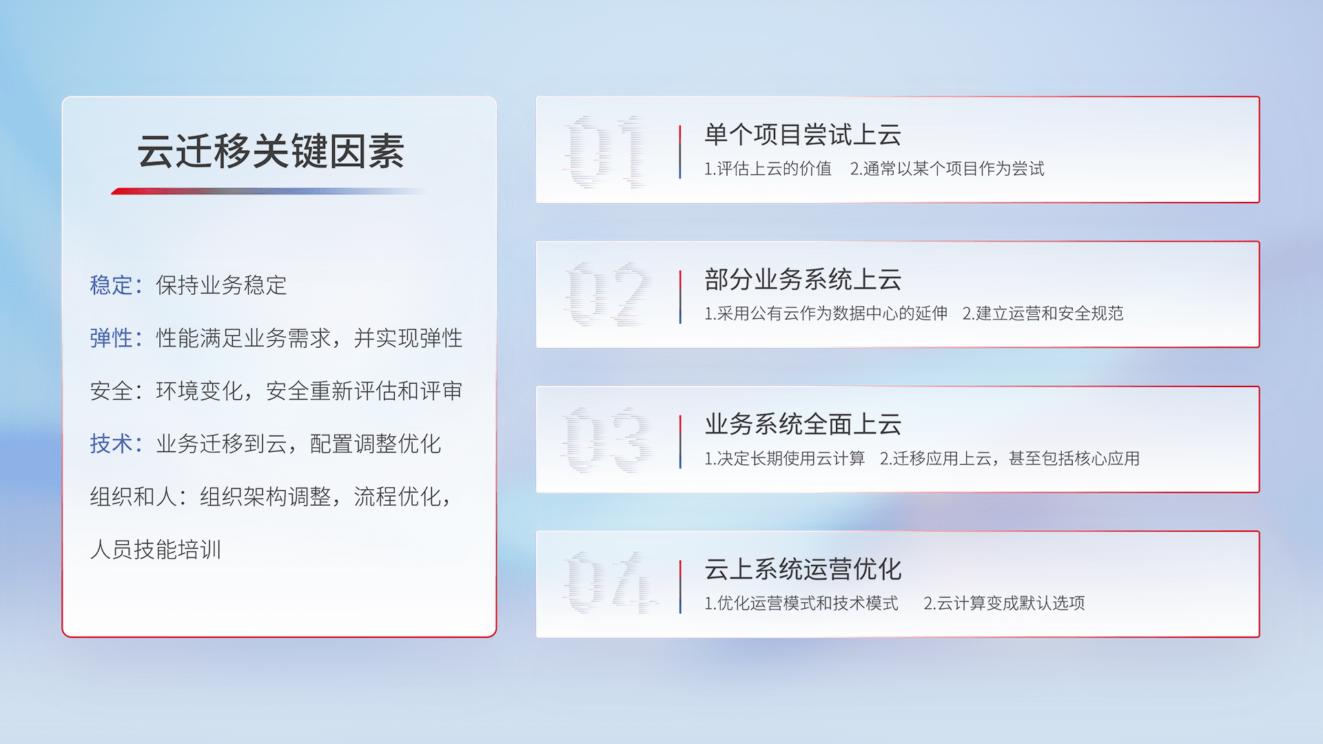 结合实际业务,,从规划设计、、、、云平台选型、、、云原生改造、、数据迁移、、、、集成交付,,迁移全过程为客户识别最佳上云路径,,,做好风险识别管理,,设计网络架构、、、身份权限、、、安全审计合规、、、操作审计、、日志审计、、、、监控告警策略、、、、多站点容灾设计等,,对云上基础设施进行整体规划,,提升IT治理水平,,以满足弹性、、、高可用、、、高性能的需求。。。。
