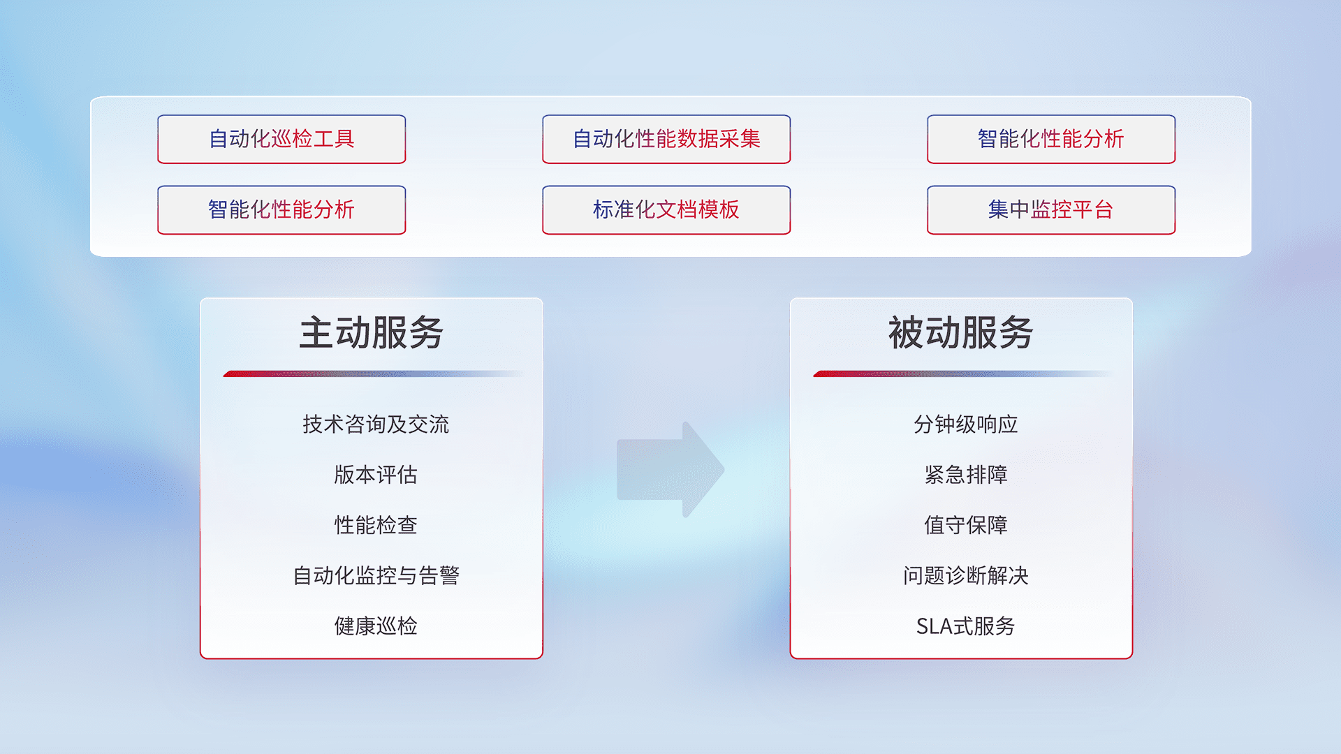 智能化工具和标准化文档,,保障服务质量,,提供主动服务(包含技术咨询、、、、版本评估、、、性能检查、、、、自动化监控与告警、、、、健康巡检)和被动服务包含(分钟级响应、、、紧急排障、、、、值守保障、、、、问题诊断解决、、、SLA服务)。。